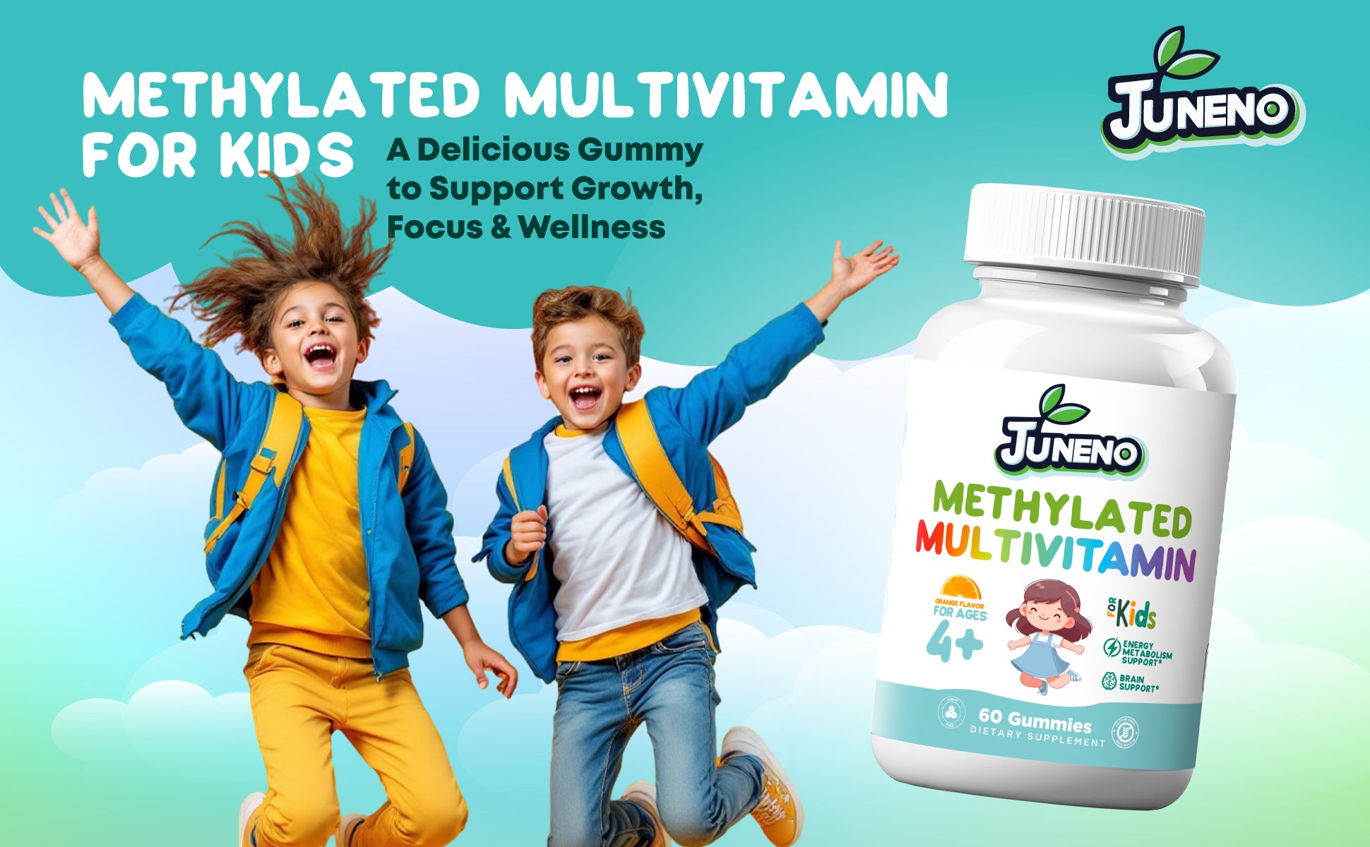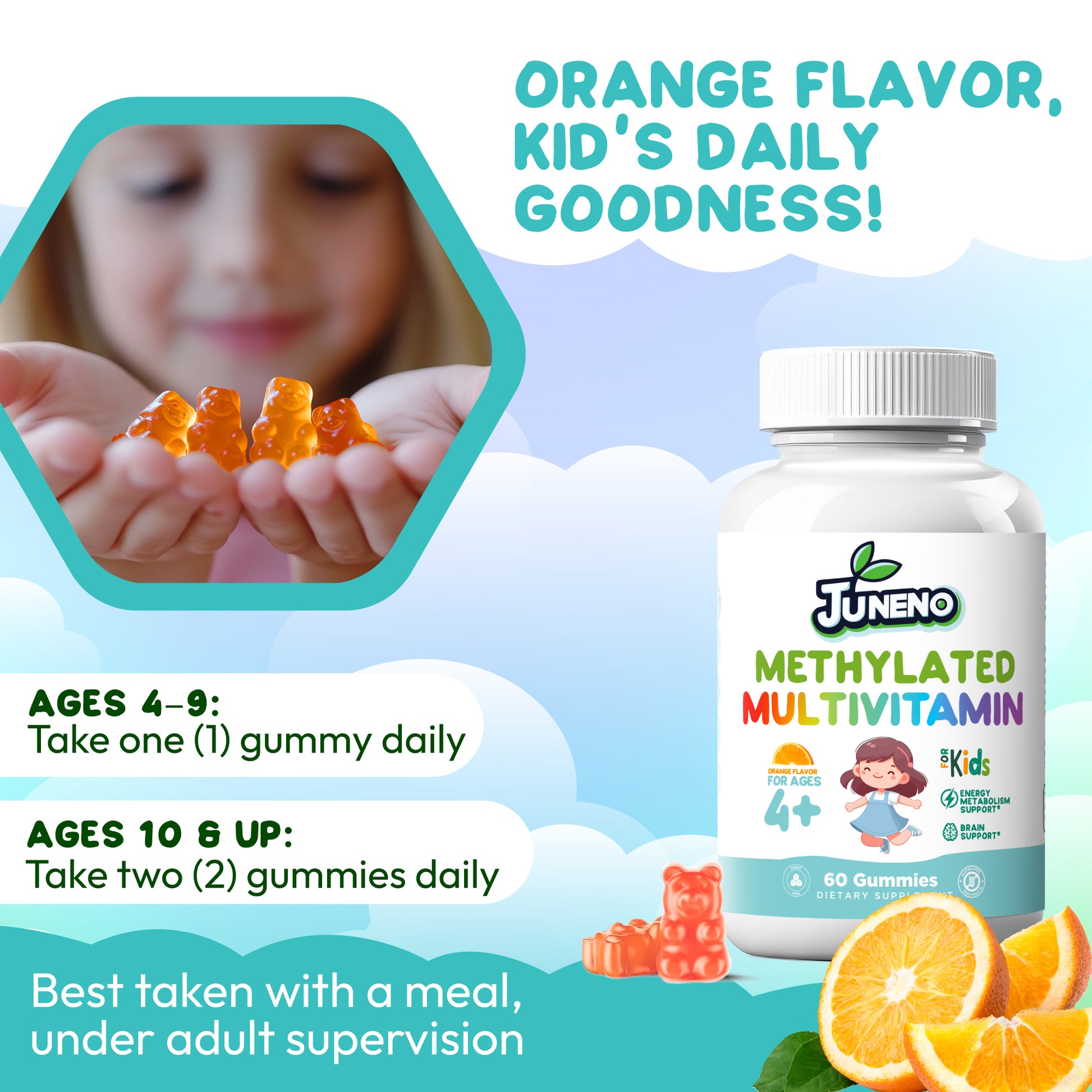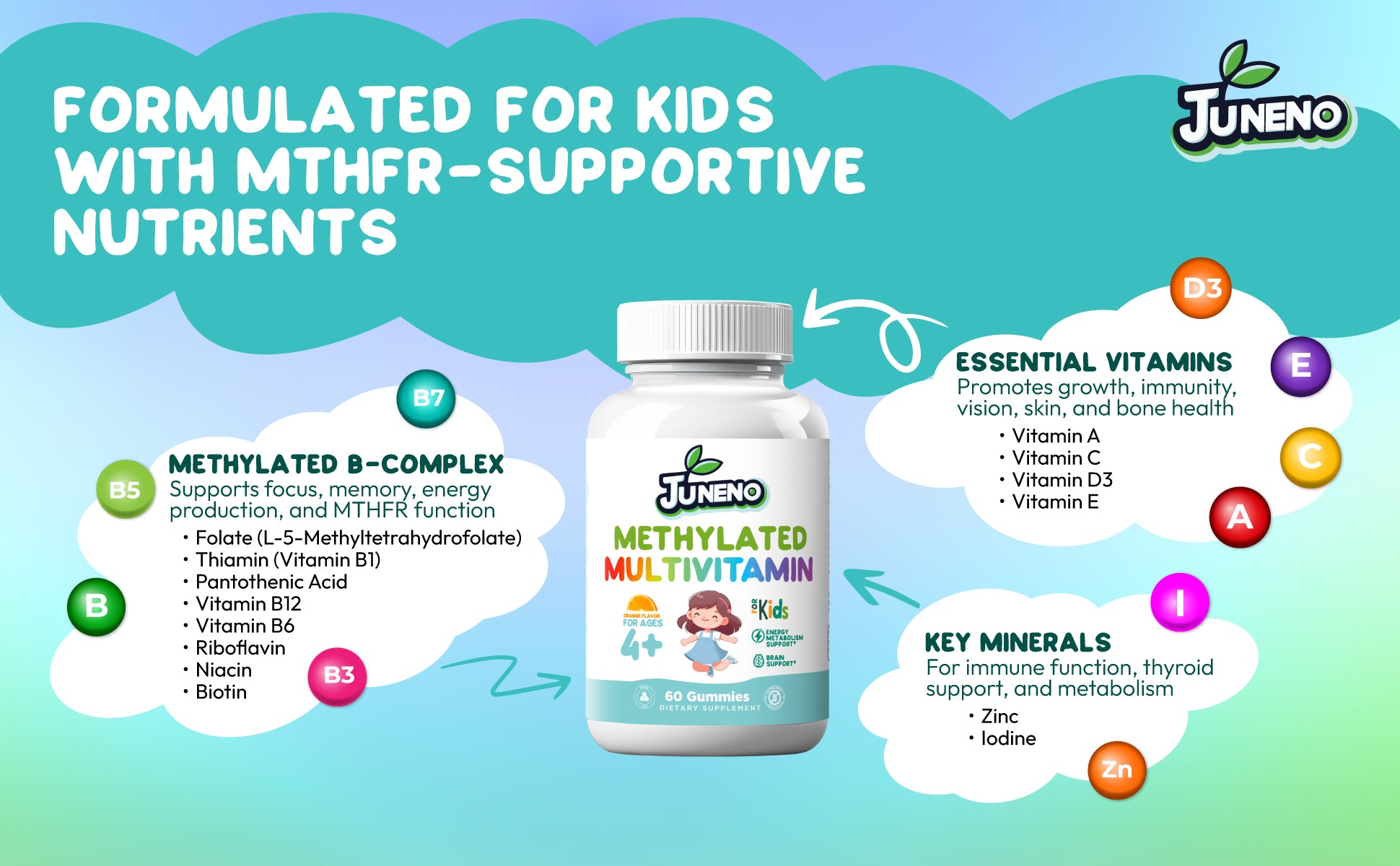 - Complete Methylated Nutrition for Kids: Juneno Methylated Multivitamin Gummies for Kids are expertly formulated for children ages 4 and up with 14 essential nutrients in highly bioavailable, methylated forms. Designed for MTHFR support, this formula features 5-MTHF methylfolate for kids, along with methylcobalamin (B12), zinc, and vitamins A, C, D3, and E, these multivitamin gummies help fill daily nutritional gaps, support healthy growth, immune defense, and overall development.