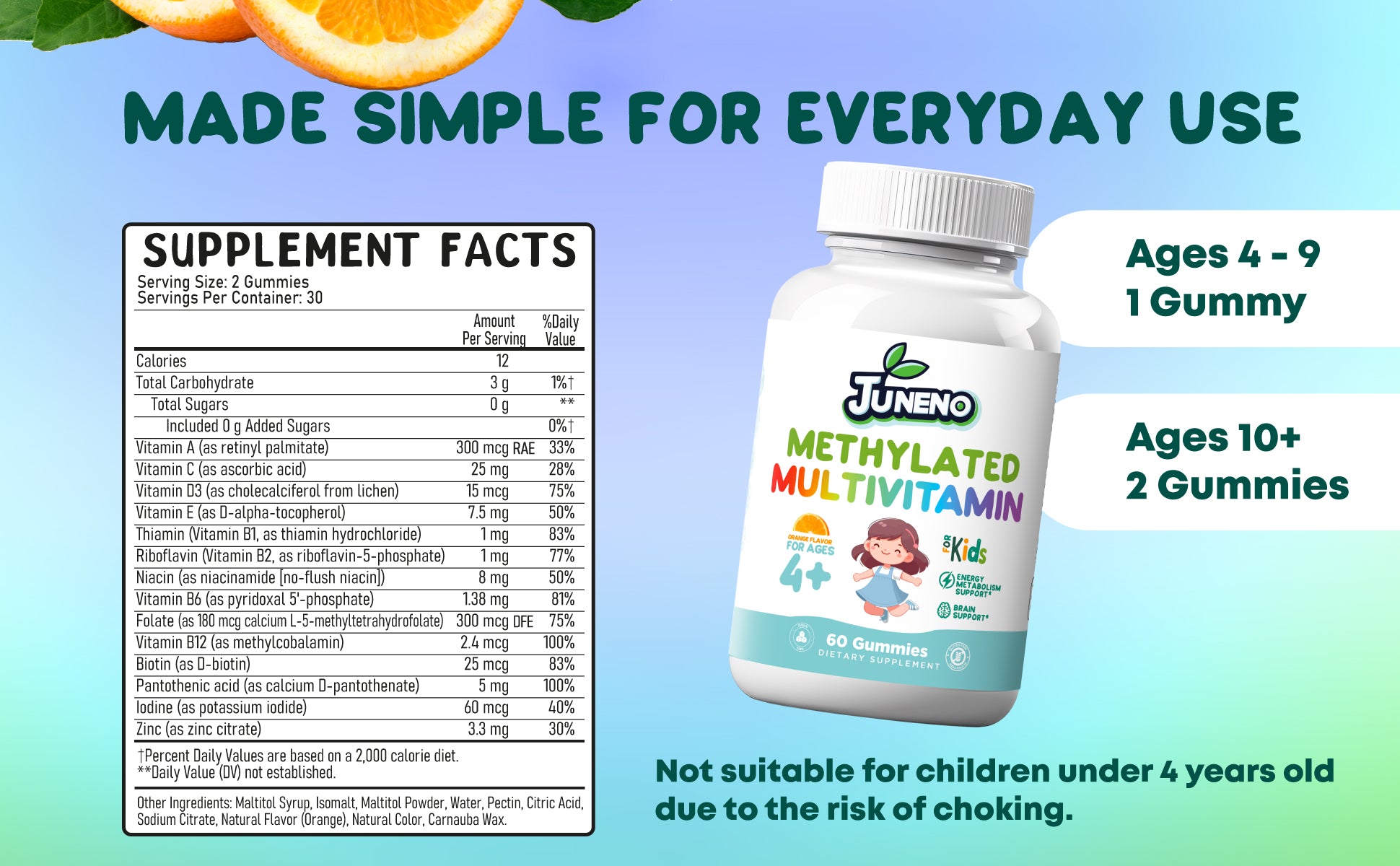 - Sugar-Free, Kid-Approved Orange Flavor: Juneno Kids Methylated Multivitamin Gummies for Kids are naturally flavored with a delicious orange taste that kids will love. These methylated multivitamin gummies, with 60 per bottle, contain no sugar and artificial sweeteners, making them a tooth-friendly option for daily nutrition. Sweetened with natural, tooth-safe alternatives, they provide a fun, flavorful way to support your child’s health, without compromising on taste or dietary needs.